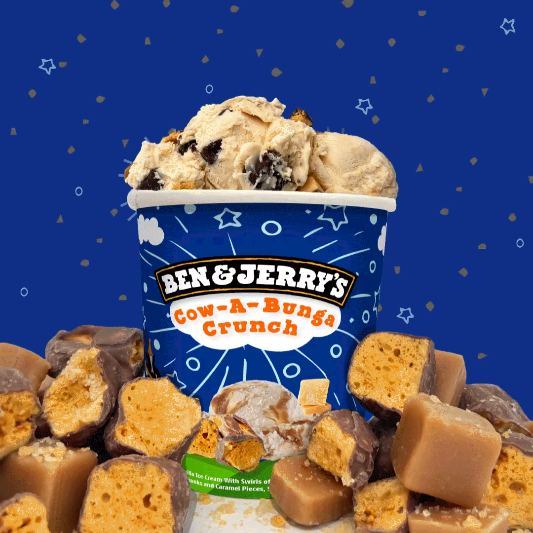 As a brand-led campaign for Ben & Jerry’s, it was important to stay true to their brand identity. I worked within their brand guidelines using their colour palette, official typography, and followed their established product photography style to ensure consistency-especially when showcasing the new Cow-A-Bunga Crunch flavour.