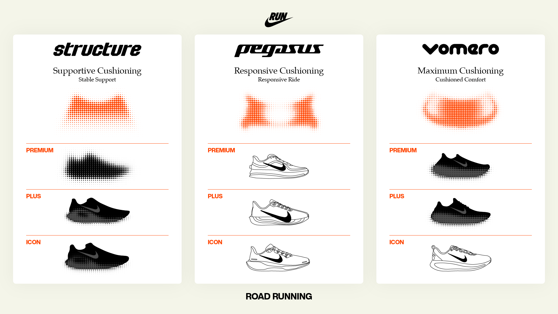 Nike tasked Accept & Proceed with designing a system that clearly showcases the three distinct cushioning types—Supportive, Responsive, and Maximum—within their key road running silhouettes: Structure, Pegasus, and Vomero.